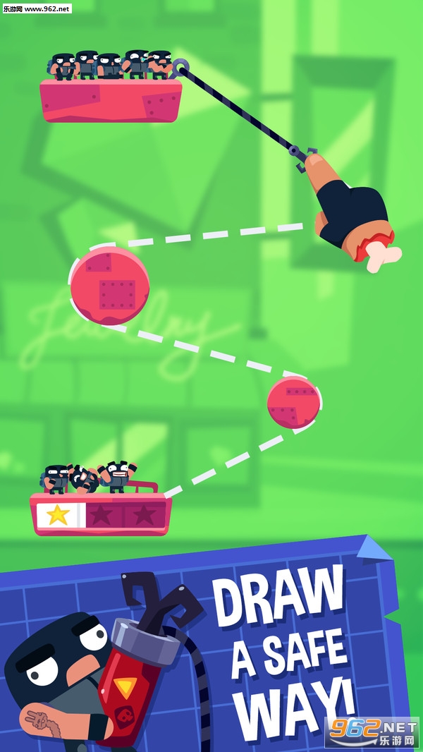 趣味的闯关游戏,前方的平台上有着宝物,玩家需要滑动屏幕连接一条绳子让强盗安全的到达对面的平台,收集宝物,注意避开一些移动或者固定的陷阱,喜欢的朋友可以下载试试。
