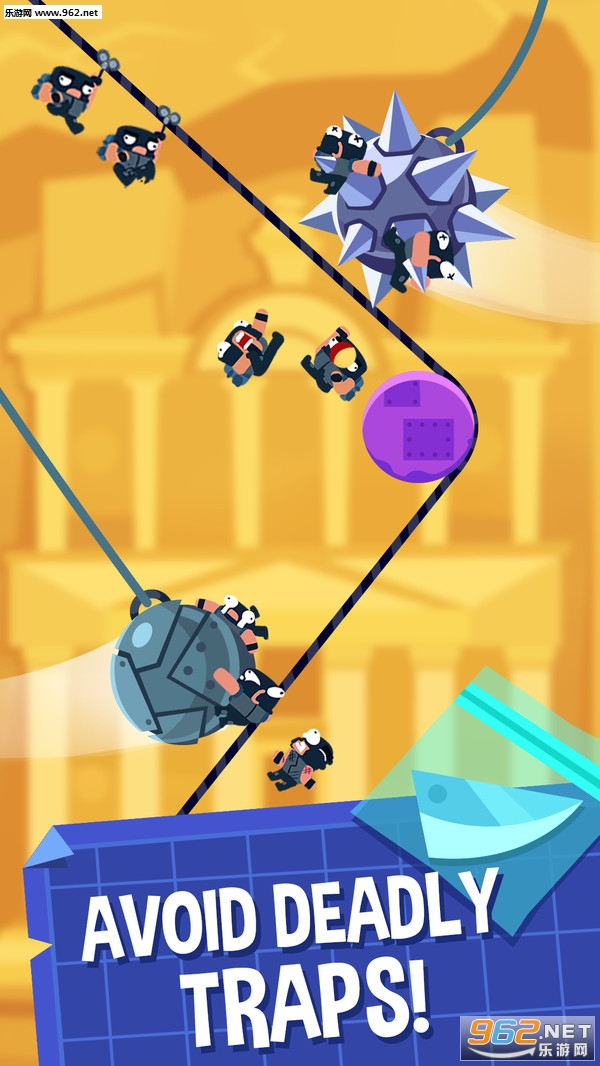 1、玩家自由控制绳索滑动的方向,你需要完美的避开齿轮和刀片,保证强盗的安全。