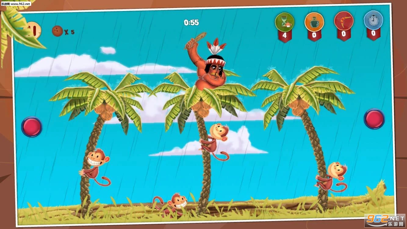 卡通画面,操作简单,玩起来非常有趣,你的任务就是不断的赶走想偷你椰子的猴子们,各个年龄向玩家都能轻松上手,适合用来打发时间放松心情。