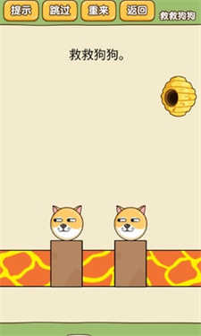 通关方法:这个关卡就是需要一笔画两个圈并且是连在一起的,一个圈住狗狗防止掉入岩浆一个圈住蜂巢挂住狗狗阻挡蜜蜂。