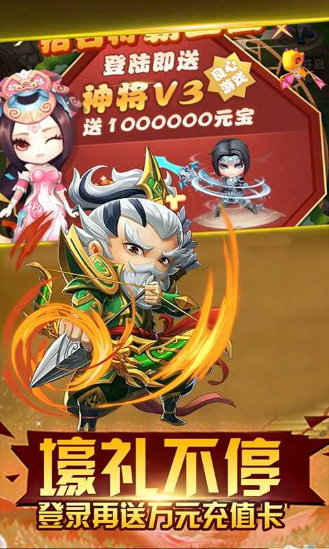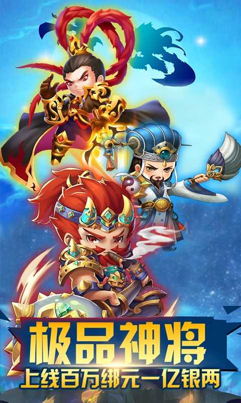 全新版本感恩来袭,登录送累计10000元充值!是一款Q版回合制RPG-H5手游。上线就送神将SVIP3及千万绑元一亿银两!游戏内冲级就能免费送万元充值卡!平台独家送变异神将*赵云、绝版时装外饰以及坐骑免费直升10阶!还有每日登陆共可领取千万绑元!上线就去连抽,神将伙伴、激萌神宠、千古红颜应有尽有!还有GM商城中的稀有资源等你来拿!玩家在游戏中将可以招降名将,结伴红颜,亲身经历讨伐黄巾、官渡之战、赤壁之战等经典战役,更可以呼朋引伴,建功立业,争霸三国。战曹操,降典韦!桃园结义,豪情义气冲云天,歃血为盟桃花园!煮酒论英雄,一震之威雷电威,天下豪强谁称王?官渡之战一统中原,赤壁之战三分天下!神将归位:五虎上将PK五子良将!谁是最终神将?铜雀春深,红颜归心,貂蝉、孙尚香、大小乔、蔡文姬等你来情定三生!