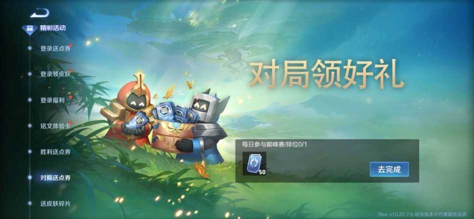 活动规则:每日完成1场排位赛或巅峰赛,即可在活动界面领取50点券!坚持对局,福利不断!