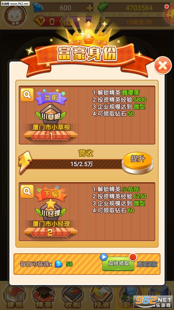 投资、谈判、签约、会议、收购、竞标……牛仔好忙,总裁更忙!从小本经营到逐渐扩大规模,再到涉足其他产业,最终创建一个横跨商业零售、地产开发和矿产资源三大产业,资产规模全球Top1的商业帝国。轻松的游戏操作、丰富的游戏模块、有序的任务系统、激烈的商战排行,充分满足您对商业经营的体验和幻想。