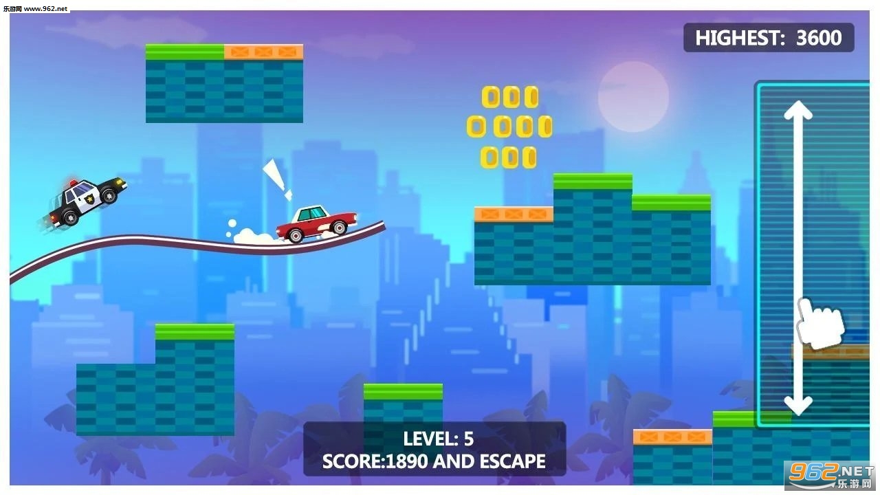 《空中逃生追车安卓版》是一款追逐逃亡系列的休闲类游戏,玩家驾驶自己的小车需要不断的突破各种障碍,摆脱警车的追捕,同时也要尽可能多的收集金币,游戏的玩法很简单,简单的跳跃操作来躲避障碍和凹坑,游戏还提供不同的小车类型让玩家解锁哦。