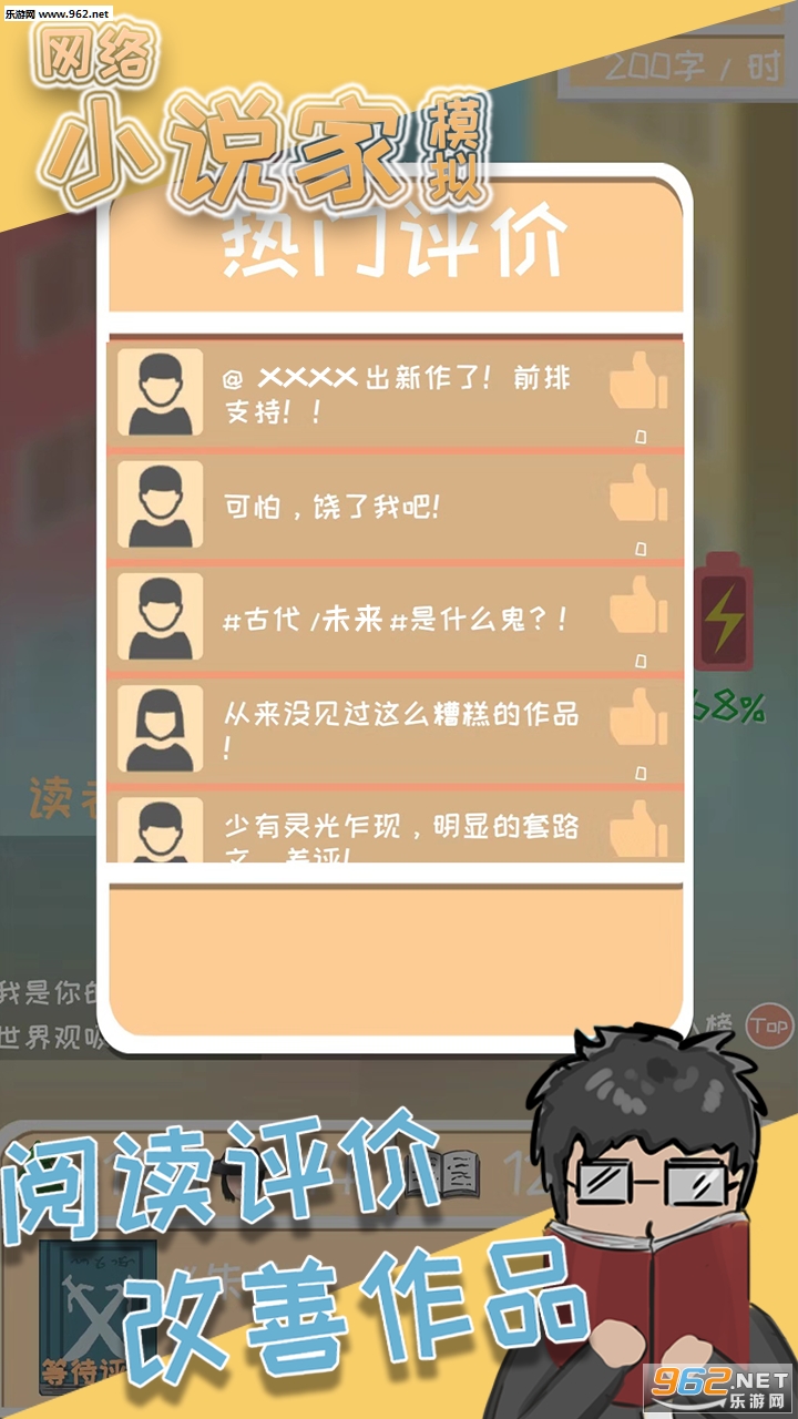 《网络小说家模拟》是一款卡通风格的职业模拟游戏,游戏中玩家将成为网络文学的创作者,网文作家。这种非常奇怪的职业,玩家需要从一开始的默默无闻开始不断的成长,成为一代大神。游戏的玩法丰富有趣,还有着各种各样搞笑的剧情,赶快下载体验吧!