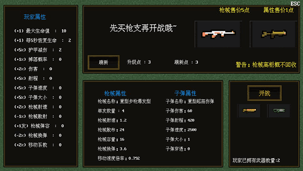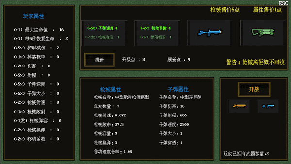 等我们升级后就可以购买武器或者属性了,一把武器需要5升级点,而属性是需要1升级点,我们最多是可以佩戴6把枪。