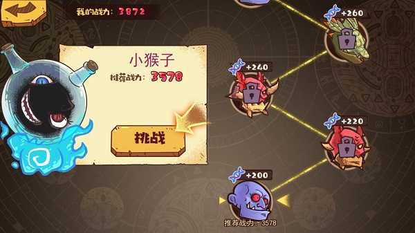 6、进入之后,会有不同的怪物等你挑战,每只怪物的战力在这里都有体现,在左上方返回键的右侧显示的是玩家当前怪物所具备的战力。