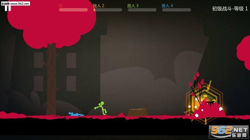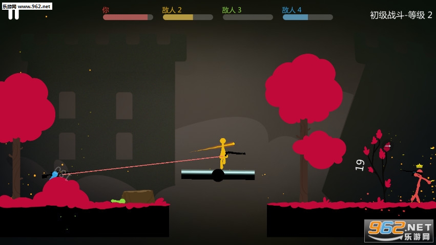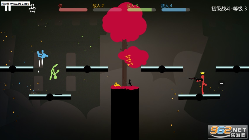 3.在比赛中,有2到4个对火柴人可以一起组队厮杀,玩家可以在游戏中与自己的朋友或玩家进行PK。