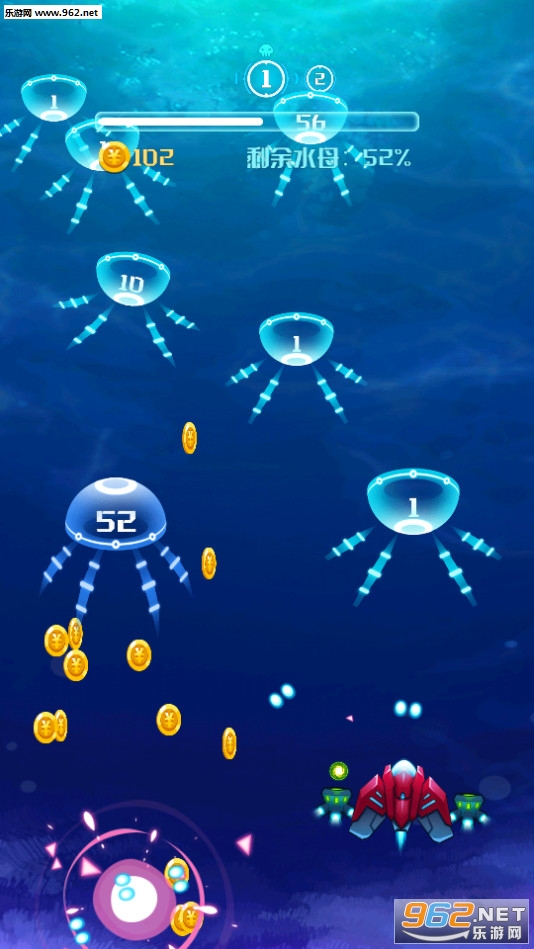 2、游戏以深蓝水域为背景,以飞机发射弹药袭击水母,来保护自己不被水母蜇,带您体验逼真的水中大战!