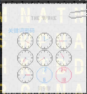 解法:9个表盘只有前7个是提示,后2个是颜色对照,按照颜色对照表盘可以获取信息时针代表顺序,分针代表字母,可列出: