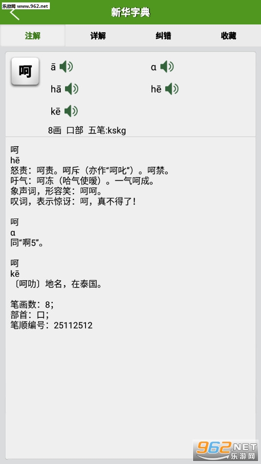 7、每个字包含了详细的字的解释和用法,以及字的拼音、笔划、部首、五笔等信息。