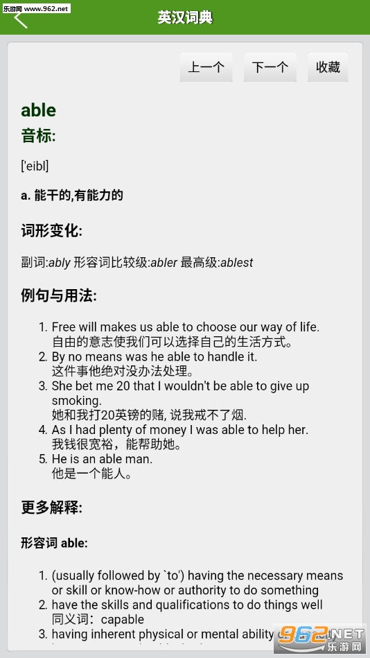 3、单词提供非常详尽的内容介绍:单词属性介绍、音标、用法和例句、词形变化、详尽的解释 。