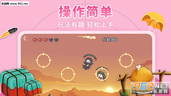 1、跟随音乐节奏出现从空中跳伞的敌人,拿起你的武器把他们变成盒子;