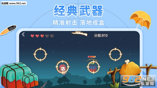 《落地成箱安卓版》是以经典的吃鸡题材设计的射击向游戏,玩家在游戏中需要利用枪支武器将天上落下的敌人全数击落即可,游戏来源于的一款小程序,现在可以作为一款单机小游戏随时随地畅快游玩。