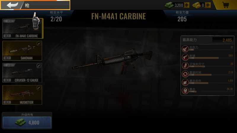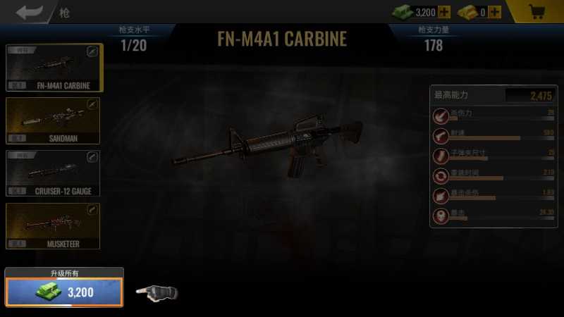 6、再点击左下角【升级所有】,使用我们获得的现金来升级自己的武器,让它发挥出更大威力,同时也能提高我们在后续关卡的生存能力。