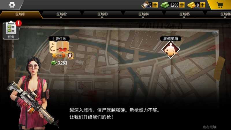 4、随着游戏的推进,我们面临的敌人也会越来越强大,所以我们可以去升级我们的武器,这里选择右下角【点击继续】。