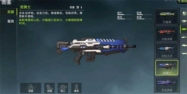 龙骑士:全自动步枪,后坐力低,弹道稳定,性能优秀,推荐新手使用,装配核心之后,可以大幅度减少换弹时间和降低开火后坐力。稳定性比较好。