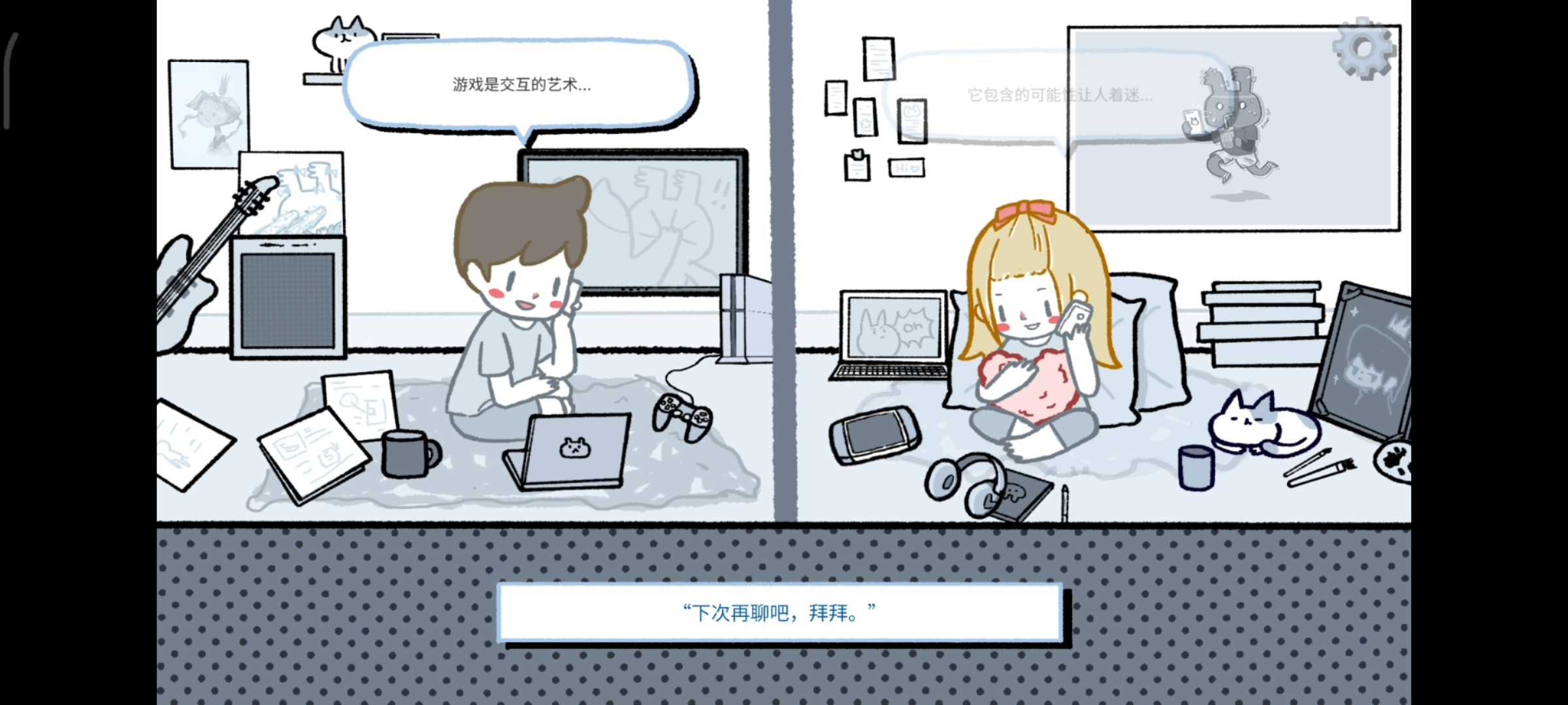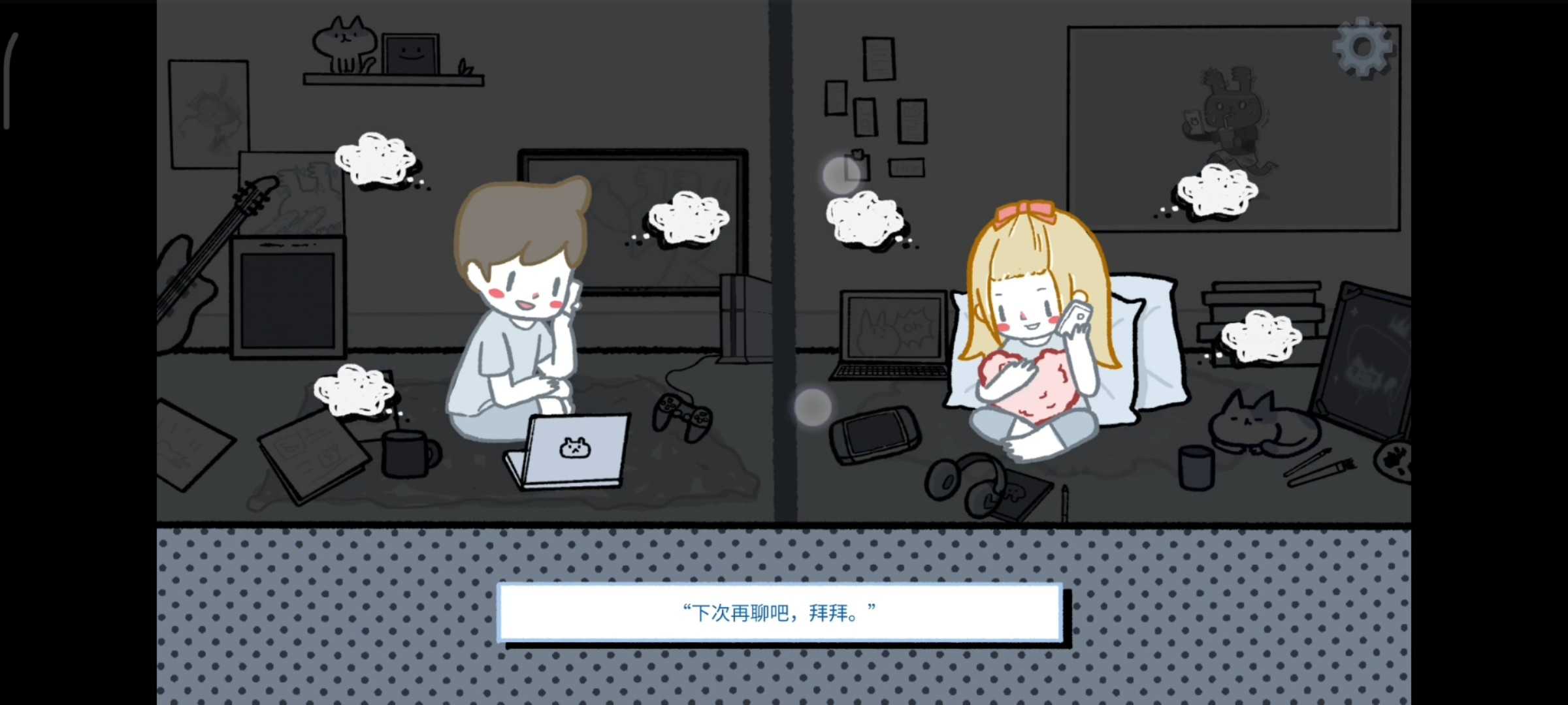 8.点两个人共同有的东西:①游戏机、手柄;②吉他、耳机③两只猫咪。 然后双指拉手机屏幕,把屏幕拉黑出现三朵??。