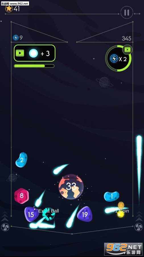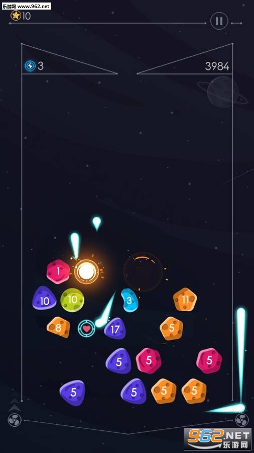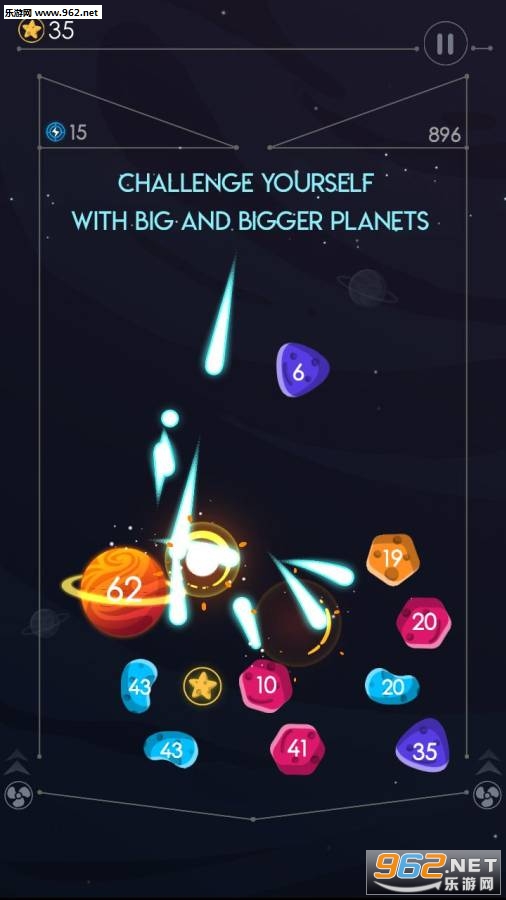 这其实是一款消除类型的游戏,而消除的对象,则是一个个形状各异的星球或是陨石了。玩家可以控制发射炮弹,并让炮弹在星球之间来回的弹射,以消除更多的星球。