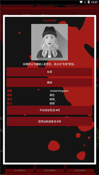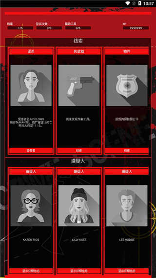 4、点击嫌疑人可以查看相关的信息,还可以使用经验分来查看嫌疑人的不在场证明和犯罪动机调查。