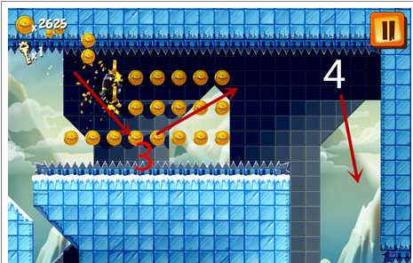 1. 当企鹅下落到位置1时,迅速向上滑动屏幕,让它跃上前方的小平台。