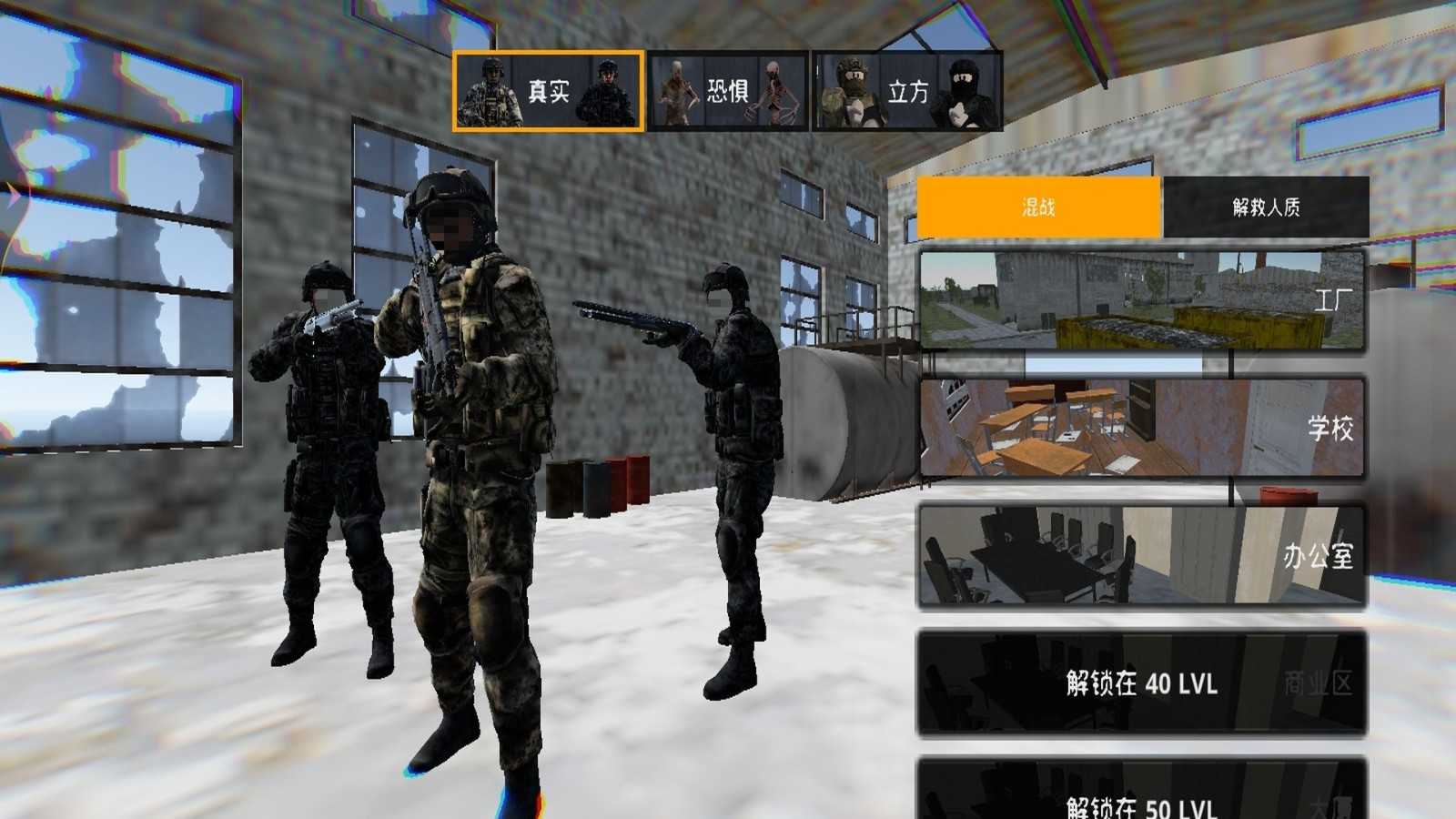 1. 进入主界面后,点击顶部可切换不同视觉风格;右侧则提供混战”、解救人质”等多种玩法模式,随心选择!