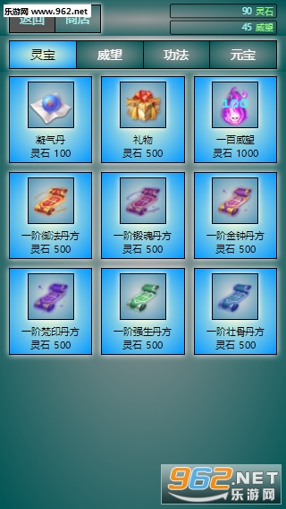3、功法系统,功法可以通过灵石到商店购买,功法加三维,还可以升级