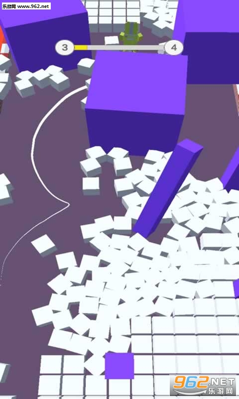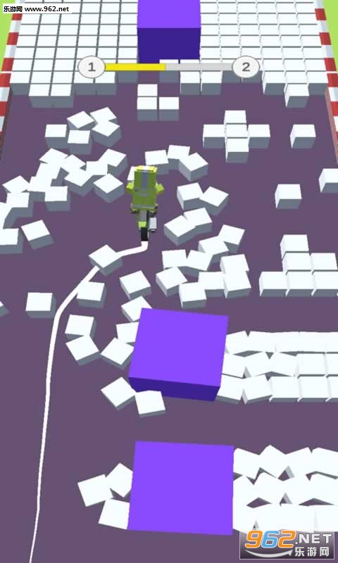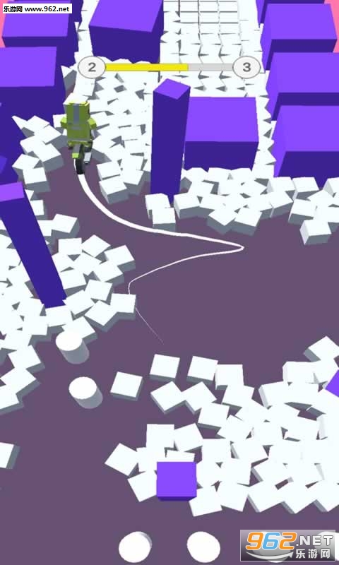 这是一款趣味闯关类休闲游戏,玩家在游戏需要控制一个骑着自行车的小人在满是方块的道路上前进,还要时刻留意千万别撞上了紫色障碍物,到达终点即可顺利进入下一关。