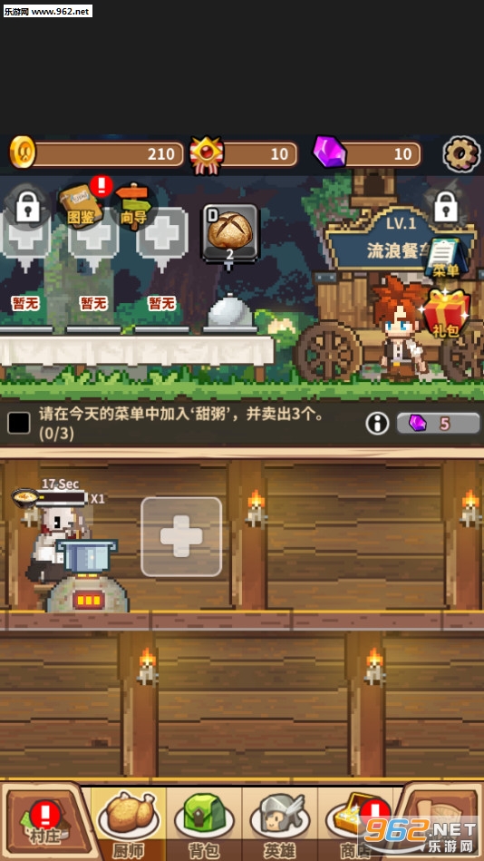 像素画风的模拟经营类型的游戏,流浪餐厅厨神有丰富的玩法,集合了经营,冒险的元素,升级你的建筑物,通过探索获得食材,解锁不同的菜谱吸引更多的顾客。