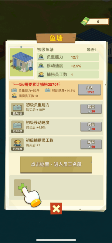 通过鱼塘小屋底部的+”号为员工安排岗位,并持续升级设施、拓展运输队、招募更高资质(普通→资深→尖端)的员工,全面提升产能!