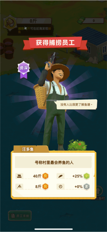 系统初始赠送一名捕捞员,记得将其分配至对应岗位,否则员工将躺平”不工作哦!