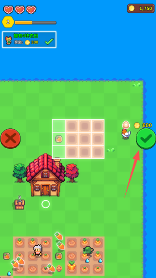 3、在地图上自由拖动农田位置,确认布局后点击右侧对钩按钮完成放置。