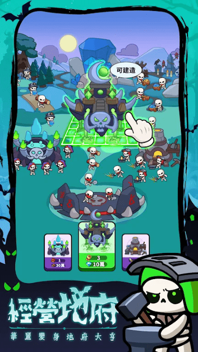 在墓地派遣骷髅兵,建造你的专属亡灵家园。每个建筑都提供不同buff加成,让你的反派之路如虎添翼!