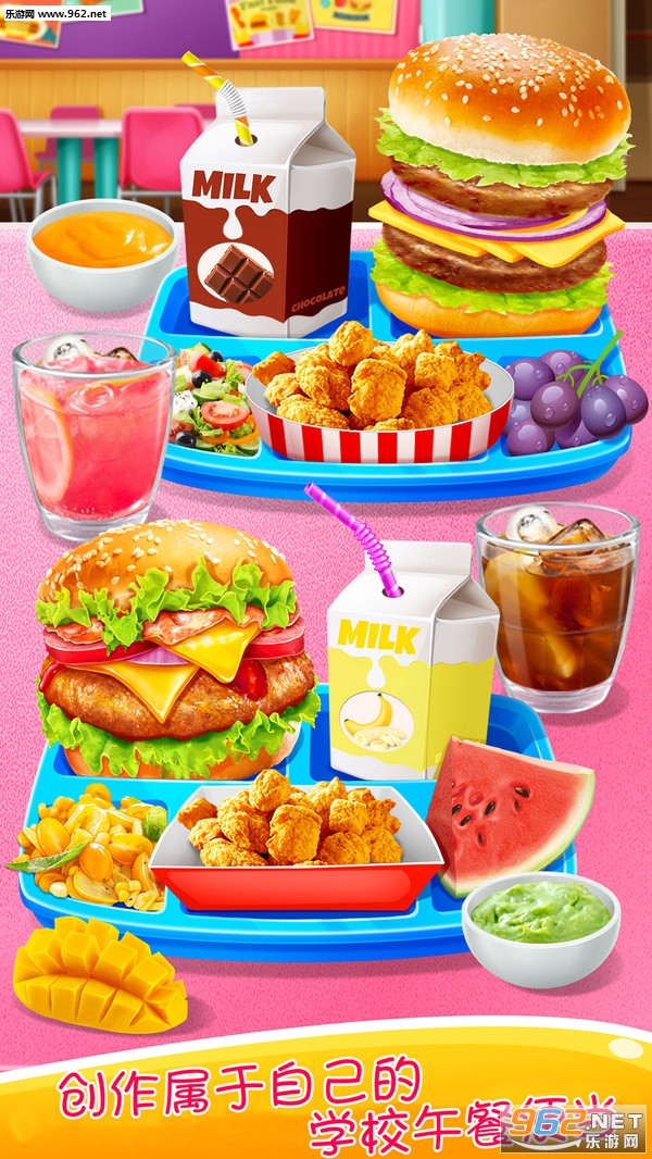 该回学校了。你最喜欢学校午餐吃什么?一个汉堡配美味的意大利香肠、牛肉、成吨的奶酪、蔬菜怎么样……这么多的配料要加。再炸些鸡米花。看着油里的鸡米花让我饿了。别忘了喝点牛奶。随便你怎么组合。现在就把你的盘子拿来做你美味的午餐。