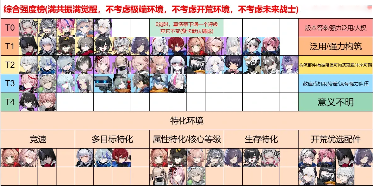 T3强度榜:阿知波、晃、伊尔、山岚、波克士、遥、朱利安、雷火、塔拉、艾略特。点评:没什么实际用处,除非是真爱党,否则在实战中还是不要派上场了,很影响实战体验。T4强度榜:奈弥、伽罗尔。点评:被玩家忽略的下水道,基本上是R级角色,没有什么意义,当仓管都不够资格。这只是开服初期版本的强度榜,并且与实际配队有关,随着版本更新,榜单会有新角色加入,会发生重大变化。根据当前的版本进行合理配队,选择核心,然后搭配强势角色和完美拼图,就可以在游戏中真正做到强势。