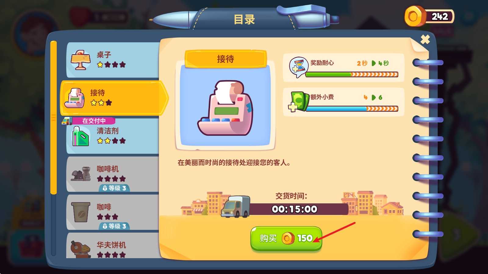 2. 在设备列表中选择你想升级的项目(如咖啡机、收银台、烤箱等),消耗金币即可启动升级。