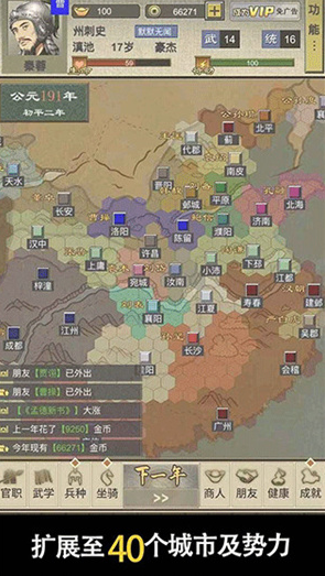 《三国人生2手机版》是一款深度还原三国历史背景的高自由度策略模拟游戏。在这里,你将化身一方豪杰,亲手书写属于自己的乱世传奇。资源管理是立足之本——无论是开垦农田、发展商贸,还是招募猛将、经营人脉,每一步都关乎霸业成败。更令人惊喜的是,每位武将都拥有专属剧情线,通过送礼、互动等方式提升好感度,不仅能解锁隐藏对话,还可能触发关键剧情转折,让你的三国之旅更具人情味与代入感。
