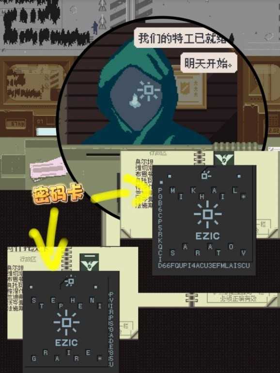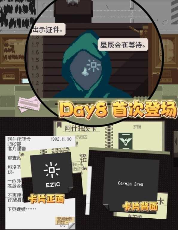 1982.11.30(Day 8):兜帽男子首次出现,递给你一张卡片,背面写着特工代号Corman Drex”。约5-6位旅客后,Corman Drex本人现身——无需查验,直接将卡片交还并放行。他会回赠你一张密码卡。