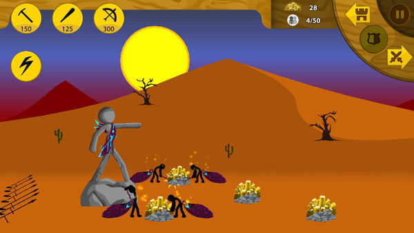 开局优先造1个矛兵探路,随后迅速拉满8名矿工(注意:每座金矿最多容纳2人,避免矿工误入敌方矿区)。敌人来袭时,手动操控矛兵吸引火力,同时召回矿工,依靠城堡弓箭手远程输出,自己举盾保护雕像即可安全过渡。