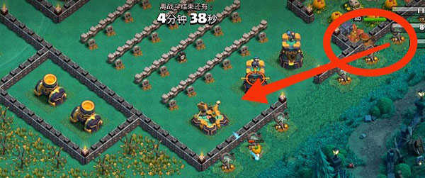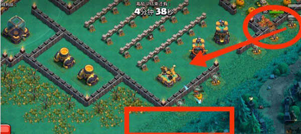 1、右侧红圈内下女武神×2,女武神会自动破墙,破墙后会去打圣水罐。