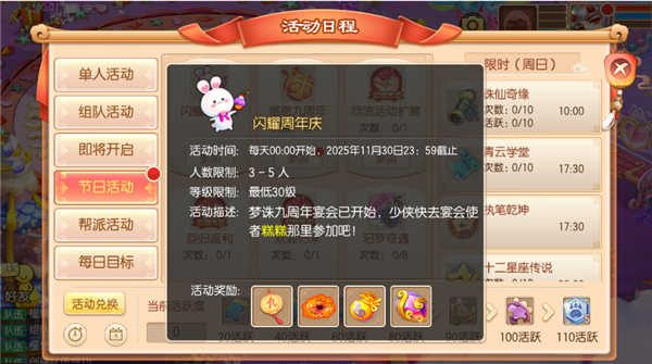 11月1日-11月30日23点59分,等级≥30级的少侠可以3-5人组队参与【闪耀周年庆】活动。快快前往各地收集被偷走的装饰物,狠狠打地鼠,让它们将兑换道具交出来!