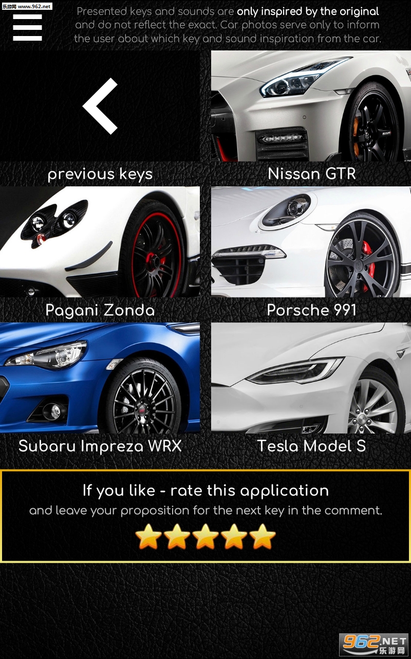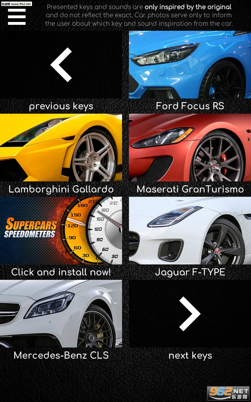 总体来说是一款非常不过的汽车声音模拟类的游戏,游戏的玩法非常的简单,打开游戏之后你会发现各种不同的汽车型号,随意的点击其中一种汽车,会出现一把车钥匙,点击钥匙上的按键就会发出各种逼真的音效,非常的爽哦,喜欢的亲们赶紧下载吧。