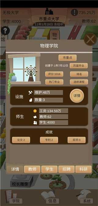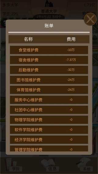 游戏前期资产的规划以及后期的规划(涉嫌游戏玩法,喜欢自己游玩和体验过程的玩家尽可能的不看):收入基本有几种,分别是学费、食堂、体育馆、政府补助、政府奖励。学费永远是大头,但是学费征收有技巧。学生人数上限分为两部分,教师数量和报考人数。不建议大量的考助教,后面会升级成为副教授,工资成倍增加,食堂前期利润不建议太低,会导致崩盘。招商食堂是前期的大头目,但是后期会有收入上线基本会维持在70-80万的样子,体育馆的收入很少而且对外开放会有一系列的问题(比如什么老奶奶来占球场还有在足球场求婚的,烦的雅痞)。政府奖励以及补贴也是前期的大头,奖励是和学校等级挂钩而补贴是靠学生评价和一系列因素来决定的,不至于说特地为了这笔钱去讨好学生。