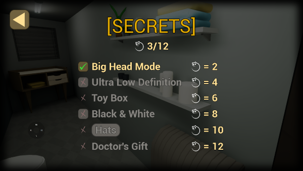 4、在这里你可以查看到秘密,也就是游戏任务,这里的意思就是让你找到超低清晰度玩具盒黑白、帽子和医生的礼物,好了接下来就由你们自行去探索吧。