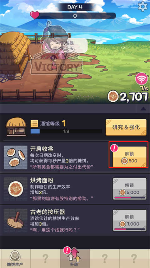 1、策略规划理性经营糖饼铺,升级店面特性招揽吸引更多消费者,赚取资金增加经营规模。