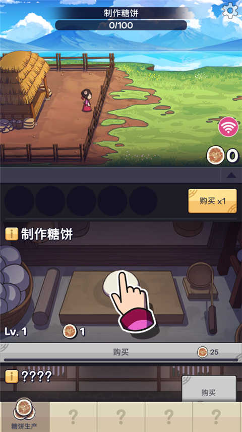 通过点击按压器按压准备好的面团,做成糖饼,用攒起来的糖饼来生产更多的糖饼吧!