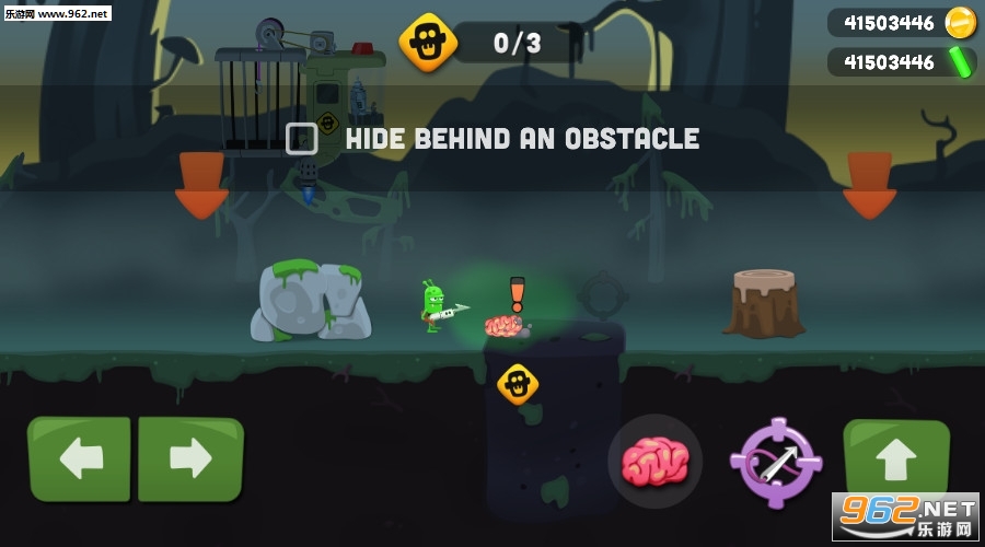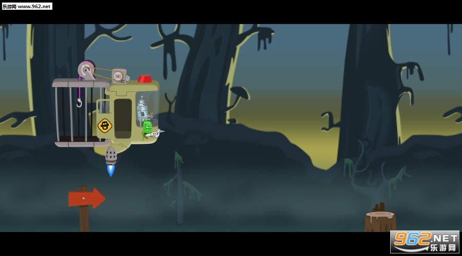 1、游戏中绿皮怪与机器人小伙伴驾驶着一艘飞碟到一片沼泽中寻找外星人的踪迹,当飞碟停止时,就可以降落开始进行抓捕僵尸的游戏了;