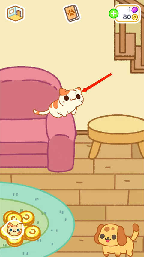 6、接下来,点击上方的【圆球】图标,这样小猫就会出去偷”东西了,