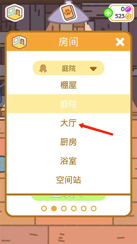 2、进入房间界面,包括棚屋、庭院、大厅、厨房、浴室、空间站等,这里以【大厅】为例,