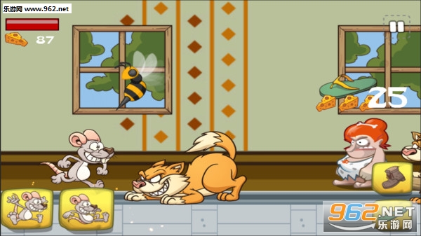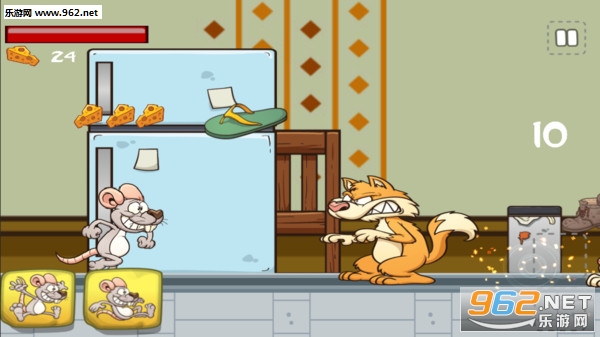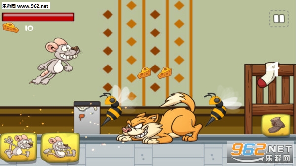 3、控制老鼠,躲避愤怒的猫,使用助力逃脱并吃掉吃奶酪。